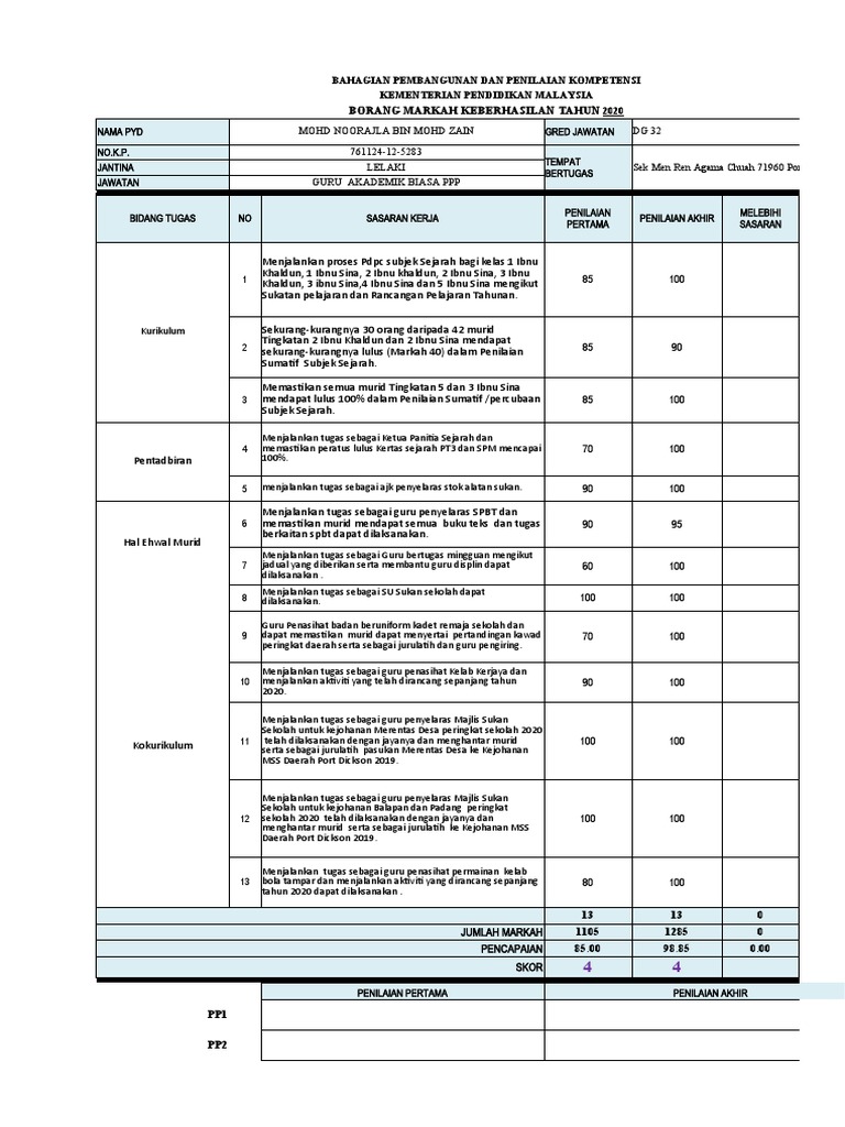 Borang markah keberhasilan tahun 2021. Jumlah markah purata pencapaian skor tandatangan dan tarikh penetapan sasaran semakan sasaran pp1 pp2 pyd markah penilaian bersepadu pegawai perkhidmatan pendidikan borang keberhasilan tahun ____ nama pyd gred nokp. Borang keberhasilan ini yang terdahulu dibincangkan sebanyak 3 kali iaitu pada permulaan pertengahan dan hujung tahun. Templat borang ini dibekalkan dalam format MS Excel dan boleh digunakan sepanjang tempoh penilaian tahun.