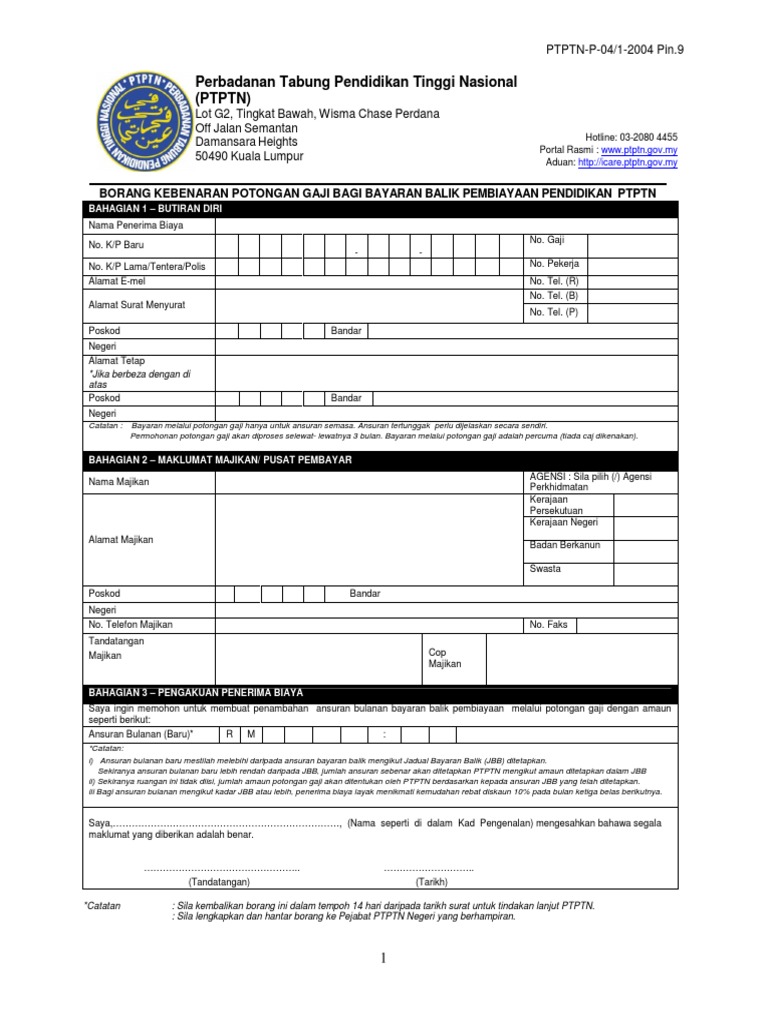 Borang Kebenaran Potongan Gaji Bagi Bayaran Balik Pembiayaan Pendidikan Ptptn Pdf